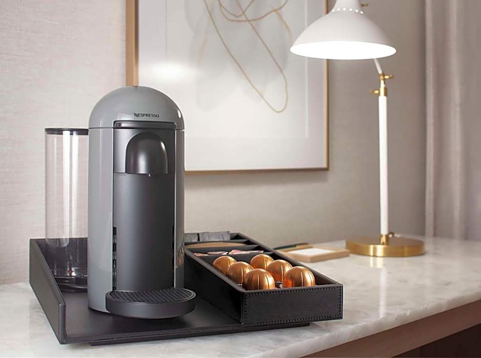 Located on a high level, this room features a a West Palm Beach city view and a 55-inch television. Modern-style furnishings and a small refrigerator are also included.